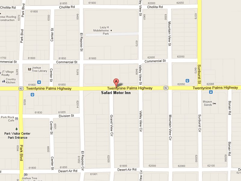 Take Interstate 10 to Highway 62 North. Take Highway 62 (Twentynine Palms Highway) to Joshua Tree. Safari Motor Inn is on the east side of Joshua Tree on the